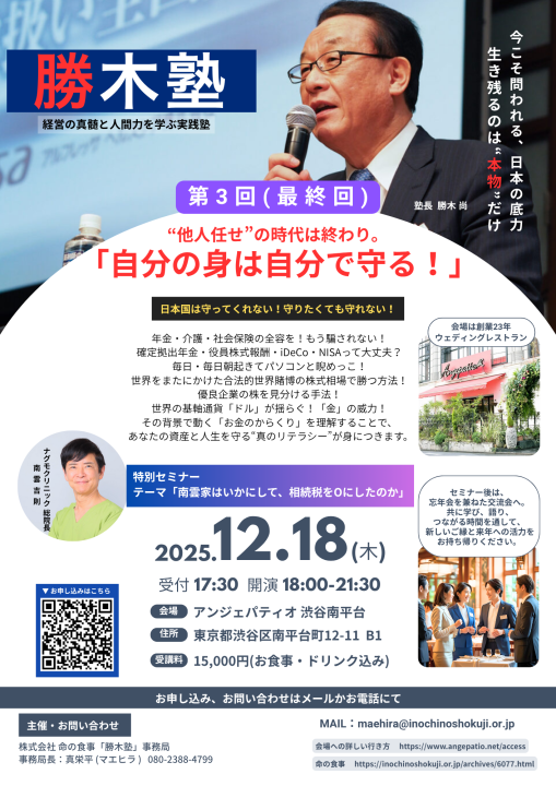 そしてそして、なんと今回特別セミナーに南雲先生も参戦!テーマ「南雲家はいかにして、相続税をOにしたのか」。南雲先生の財テクについてもご期待ください。